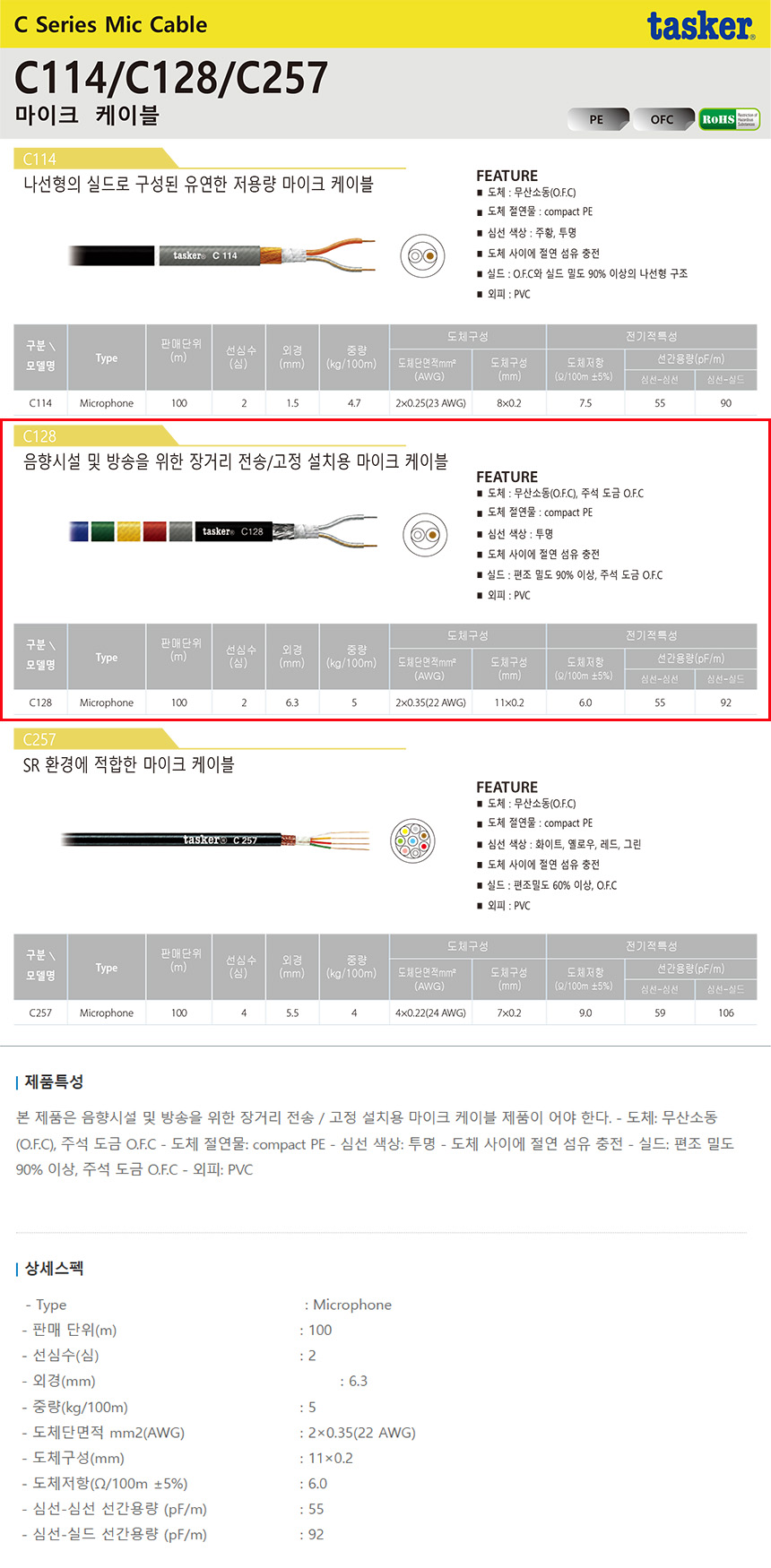 > TASKER C128 마이크케이블 무산소동 PVC 2x0.35