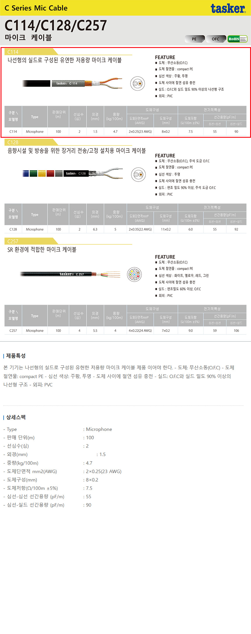 > TASKER C114 마이크케이블 무산소동 PVC 2x0.25