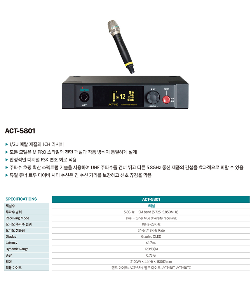 > 미프로 ACT-5801H 5.8GHz 1채널 핸드 무선마이크세트 MIPRO