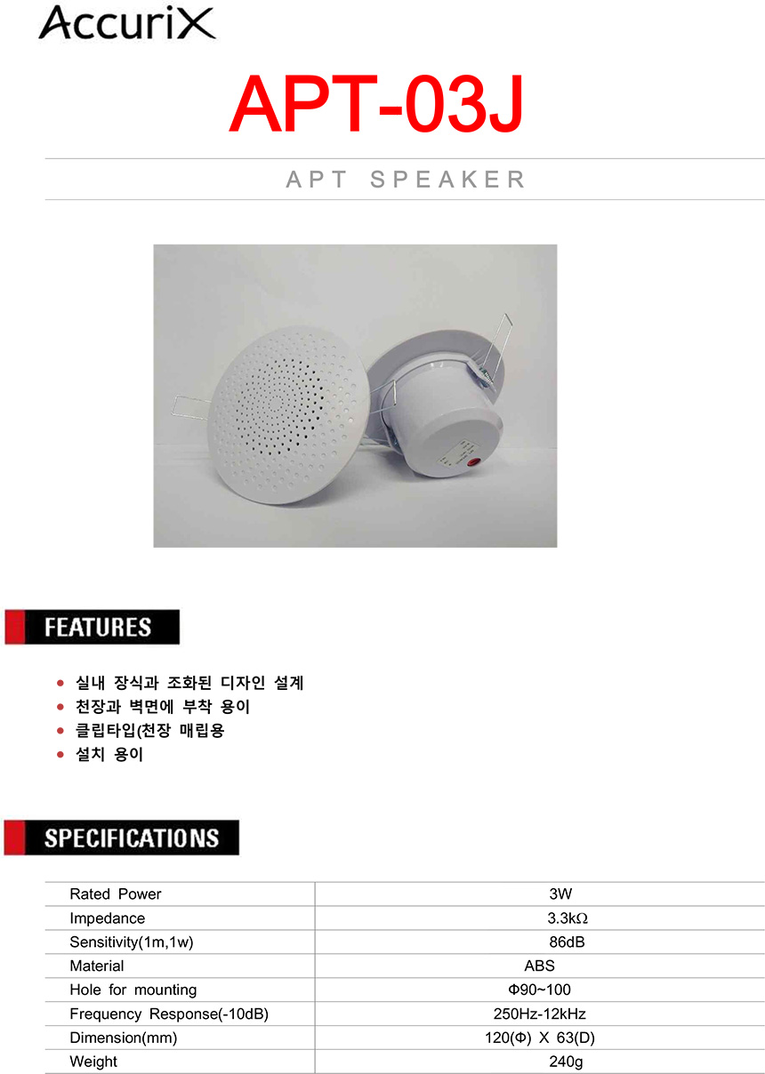 APT-03J 3W 원형 실링스피커 타공100파이 아파트스피커 매입스피커