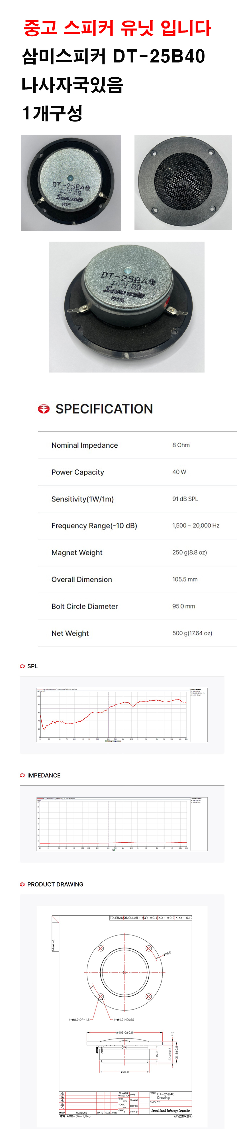중고상품 DT-25B40 고음스피커 유닛 1개 삼미스피커
